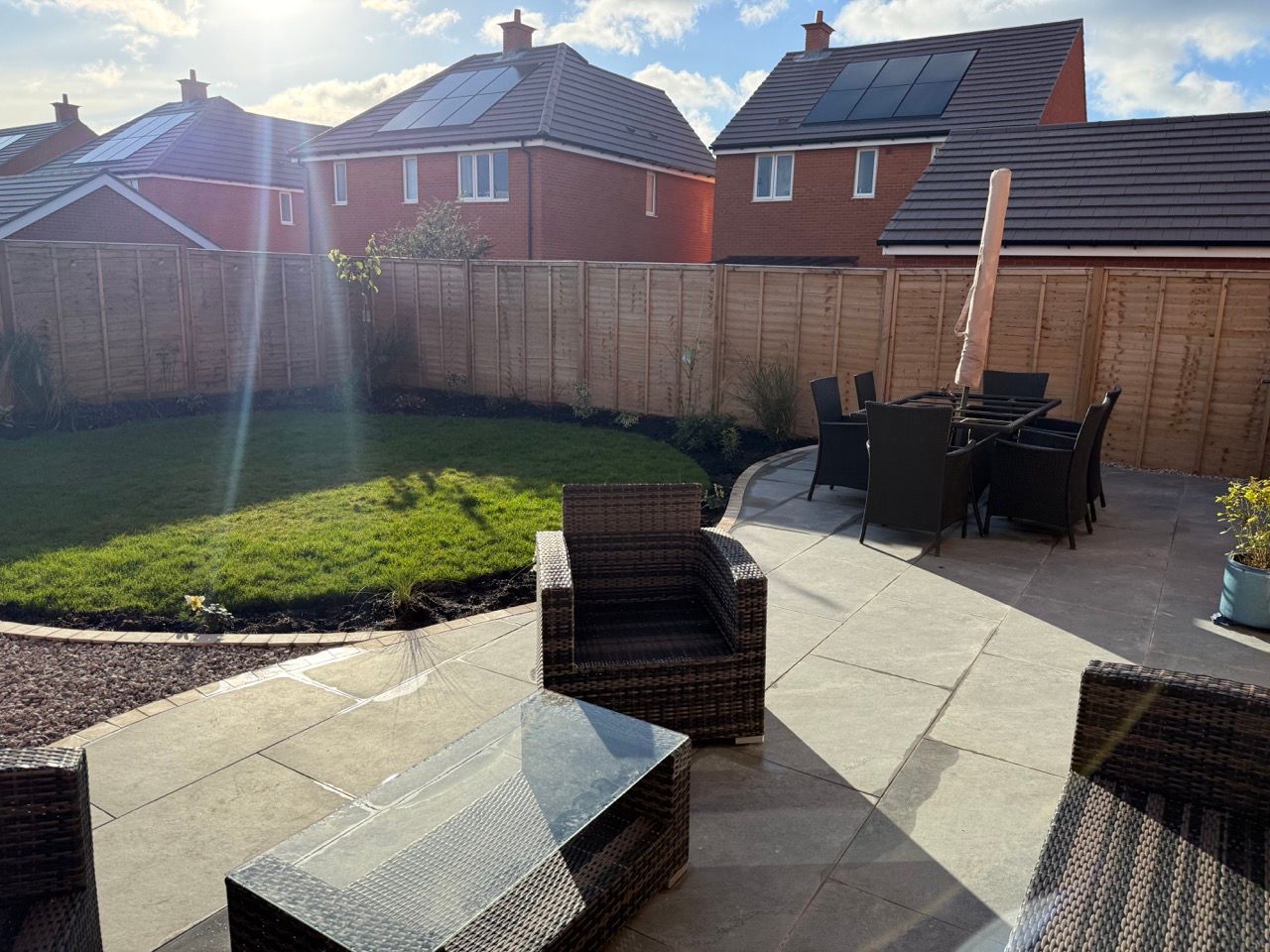 New patio, fence posts and panels installed, lawn laid, patio renovated